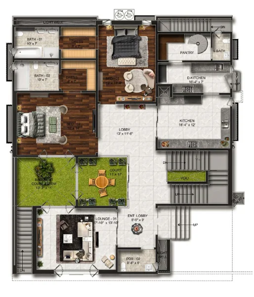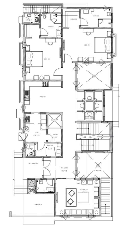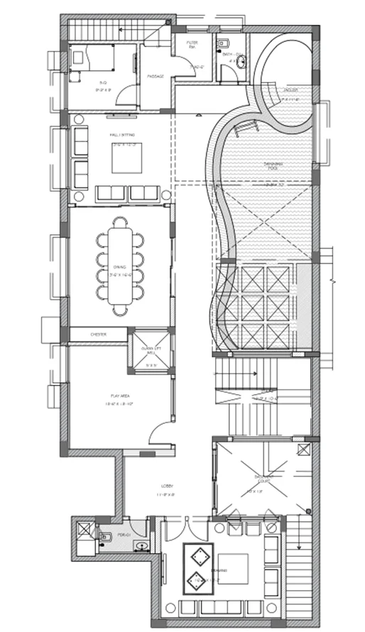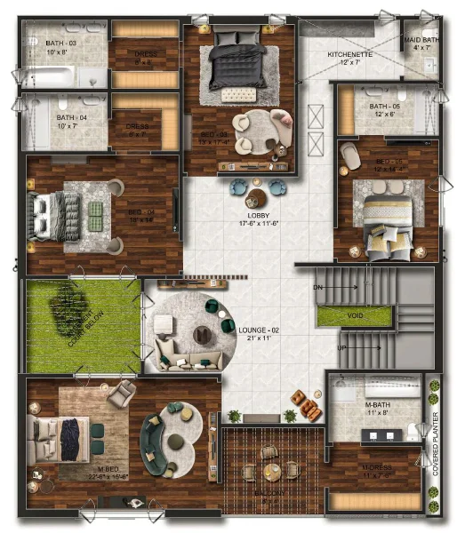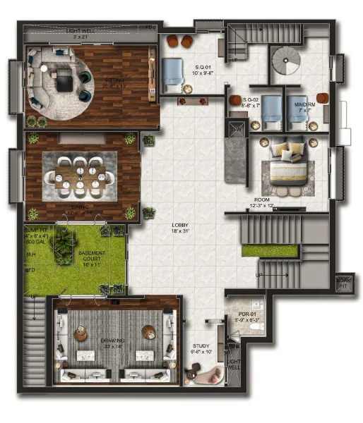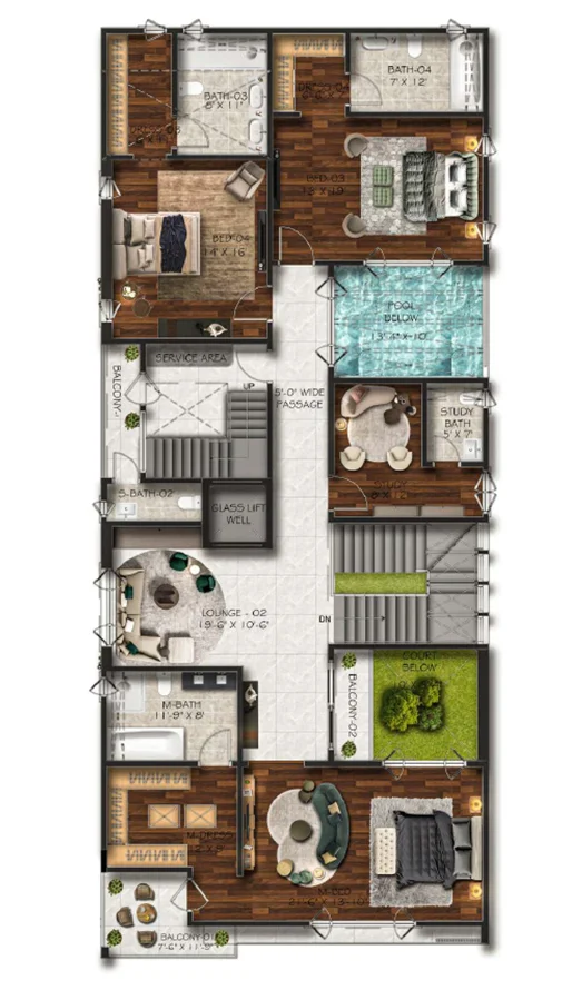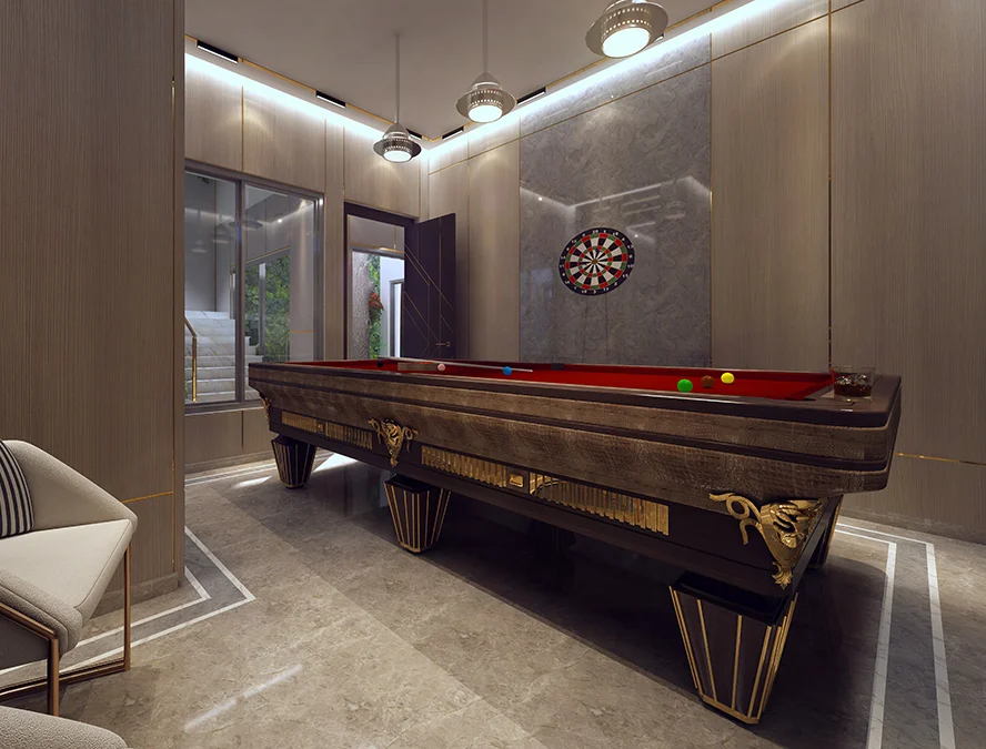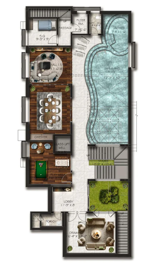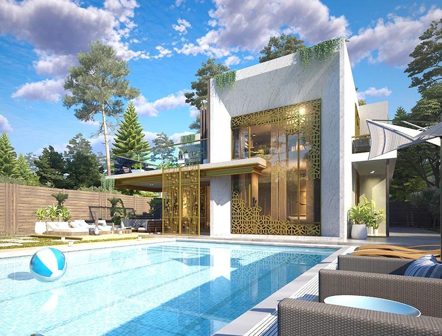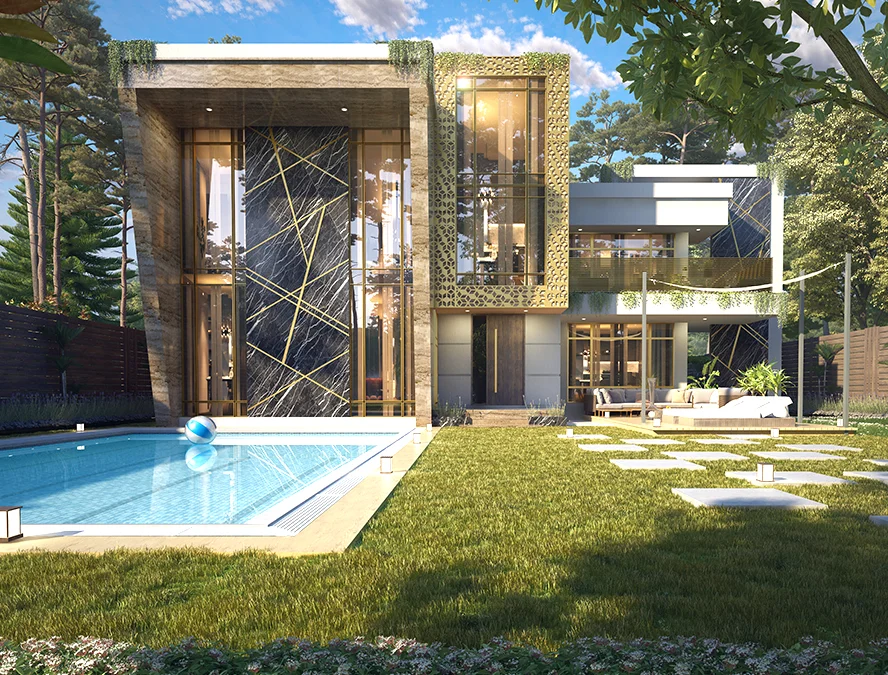 This 1 Kanal (500 Sq. Yd.) Type-A villa is the epitome of luxury which combines contemporary style with functional design. Its modern exterior leads to an expansive interior crafted with premium materials. The villa features a luxurious outdoor area which includes a large green space and swimming pool. It is decorated with the finest materials, and stunning private lounges for relaxation and social gatherings.
